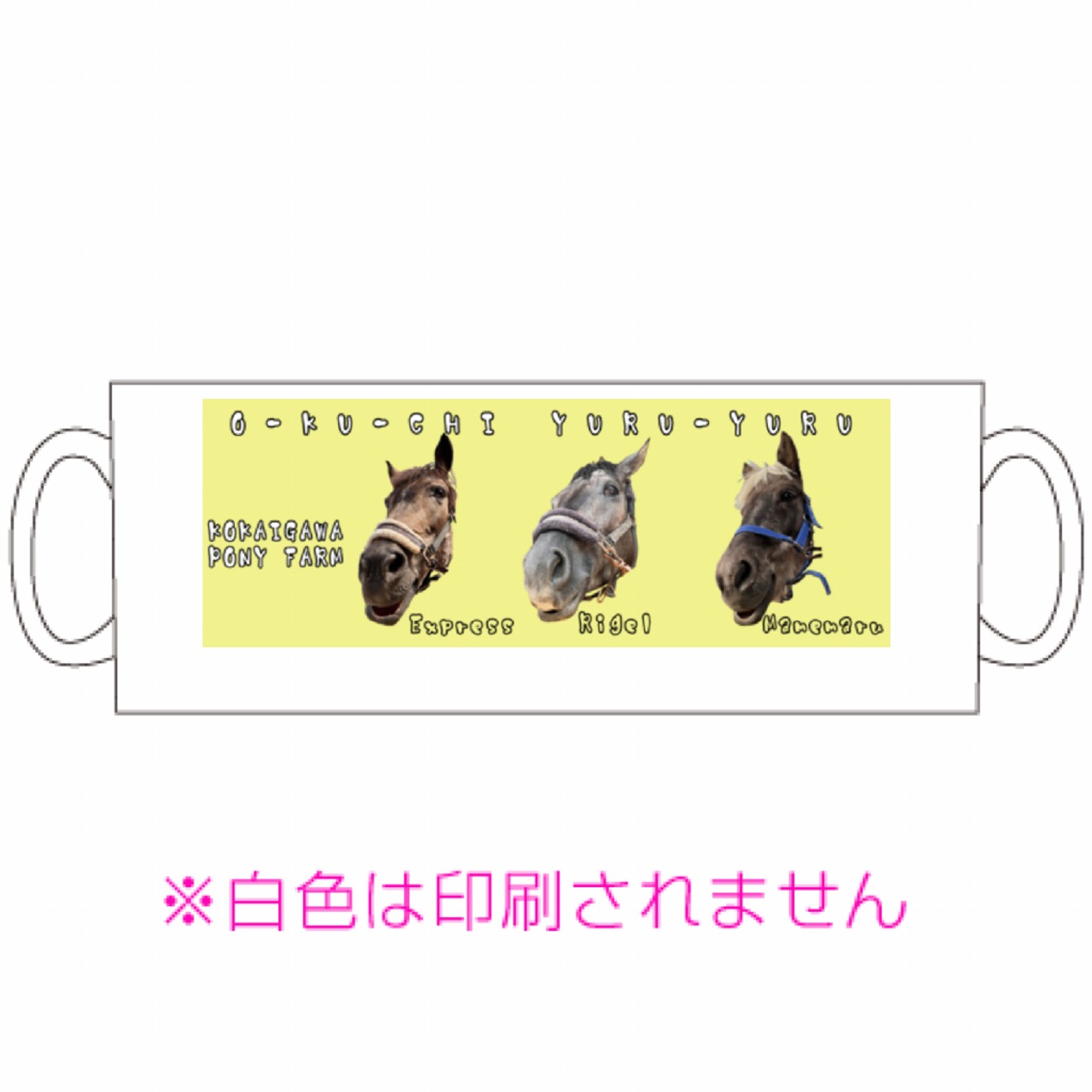 お口がユルユルしている3頭のポニーが映った、300mlマグカップです。
